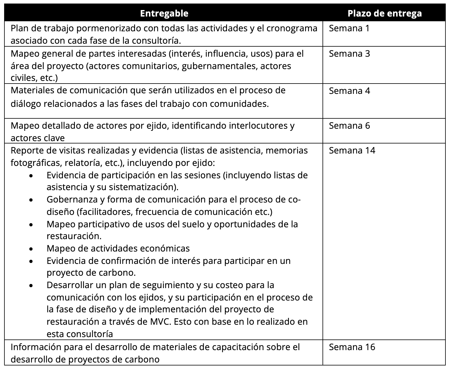 La presente consultoría busca sondear el interés de ejidos en los estados de Yucatán y Campeche en participar en un proceso de co-diseño y desarrollo de un proyecto de restauración con financiamiento derivado de la certificación de remociones de carbono de alta integridad bajo principios de liderazgo comunitario, el fortalecimiento de capacidades en gestión de proyectos de carbono y la generación de beneficios sociales, de conservación de ecosistemas y medios de vida sostenibles.